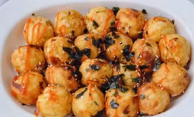 (4)戴上一次性手套,取適量麵糊團成圓球狀,平底鍋少許油下入丸子。