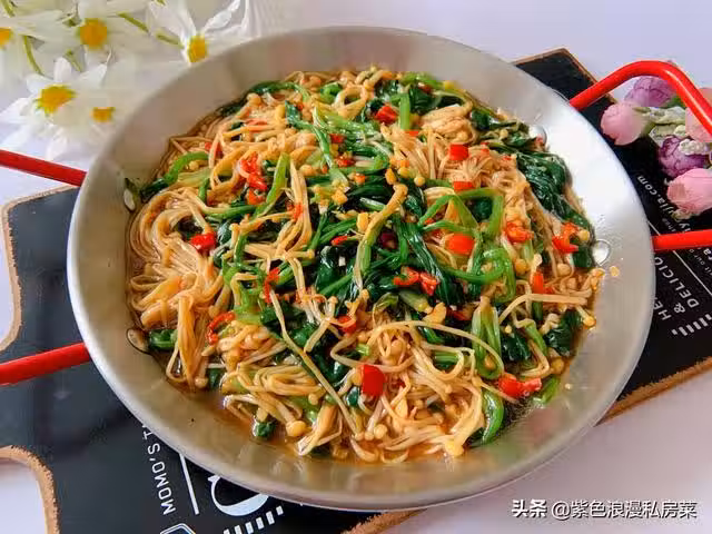 2.鍋中放清水,放幾滴食用油,一勺鹽,水開後放金針菇,放菠菜焯水撈出,倒入涼拌汁拌勻即可。