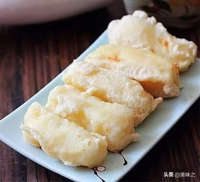 8、鍋中油燒至六七成熱轉小火,將奶糕放入油中炸。