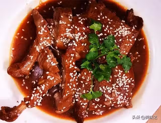 6、將鴨腿切塊澆上滷汁撒上白芝麻用少許香菜點綴,味道棒棒噠的!