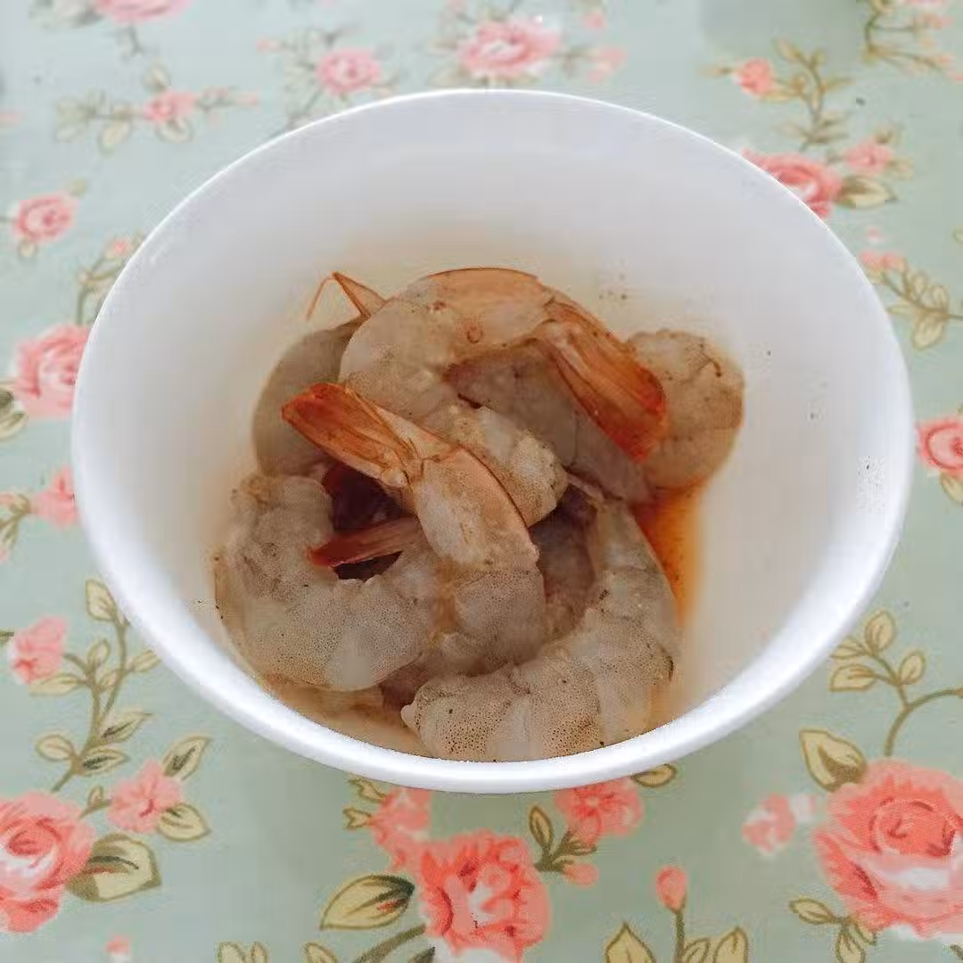 2. 鮮蝦去頭撥皮留尾用料酒,胡椒粉,鹽,腌制15分鐘左右
