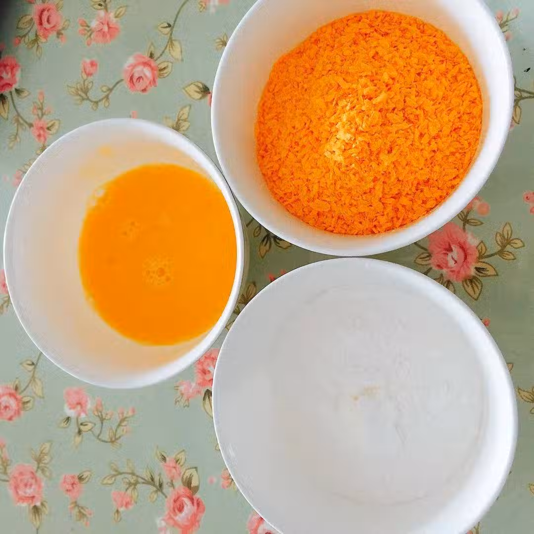 4. 依次裹上1.澱粉(麵粉也可以),2.雞蛋液,3.麵包糠