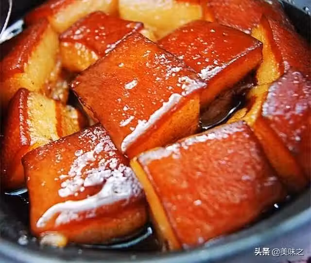 6、倒入糖色水沒過肉塊,調入3勺老抽、2勺醪糟汁、紹酒2勺。