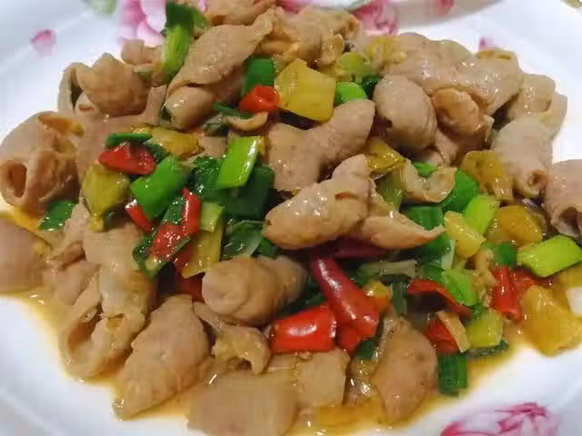 肥腸、泡辣椒、蒜苗、醬油、蚝油、鹽、油。