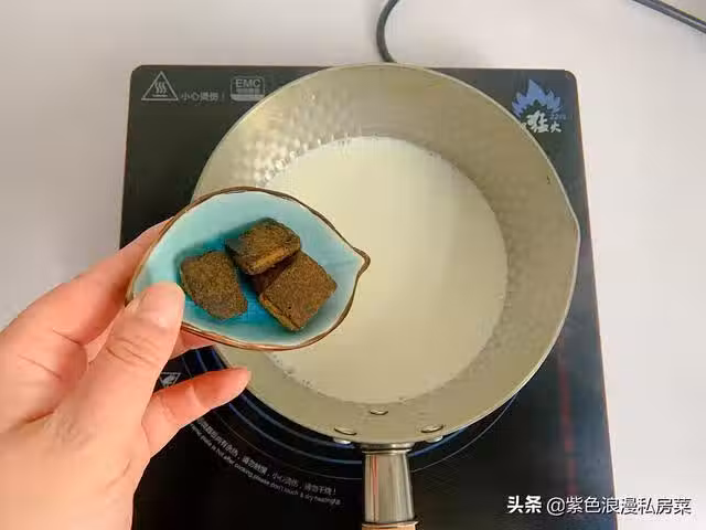 4.牛奶倒入奶鍋中,放紅糖,開最小的火,將紅糖慢慢融化。