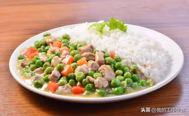 4、鍋燒熱,淋入油,倒入瘦肉粒翻炒至變色,倒入青豆,胡蘿蔔翻炒1分鐘,淋入生抽,鹽再翻炒均勻,出鍋之前淋入水澱粉,盛入米飯,澆上豆胡蘿蔔瘦肉開吃吧