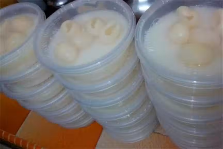 3. 把豆漿倒入膠盒,待冷些,加入龍眼肉,就放入冰箱,冷了就可以吃了。