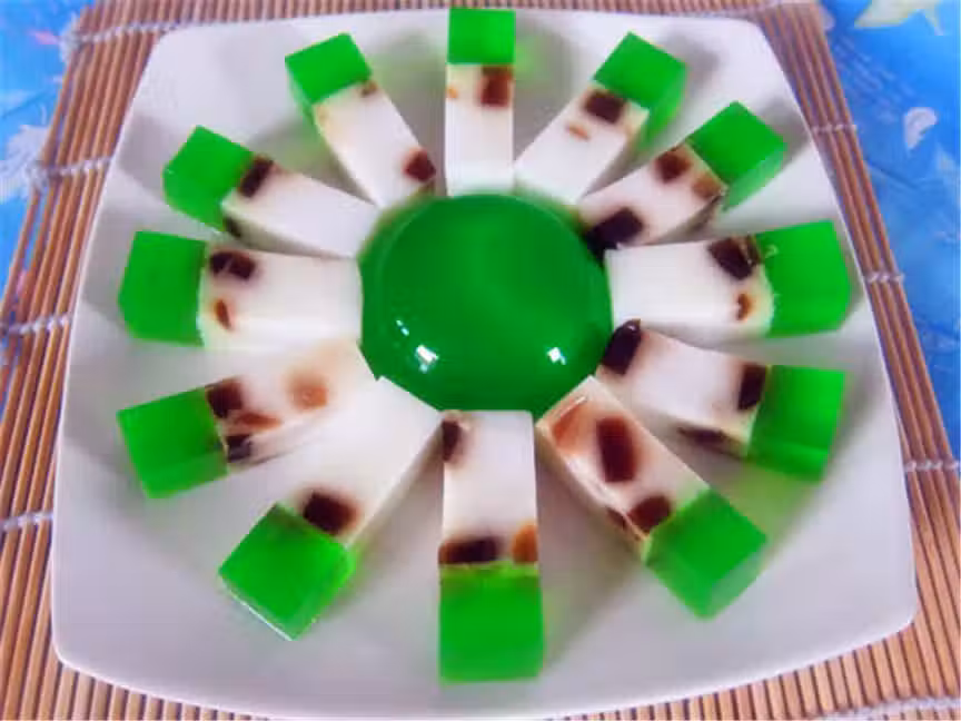 6.把過濾好的椰漿燕菜倒入模具中7分滿放至稍凝固。 (底層完成)