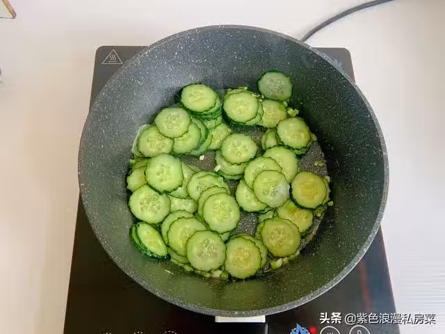 4.用鍋中的底油,將蔥花爆香,放黃瓜片翻炒。