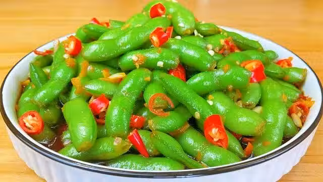 毛豆涼後瀝干生抽,醋,糖攪拌好熱鍋下油,油熱小火下八角花椒,炒出香味,關火,撈出,倒入干辣椒大蒜生薑炒一下調好的醬倒進去,注意小火炒一下就可以,關火晾涼。