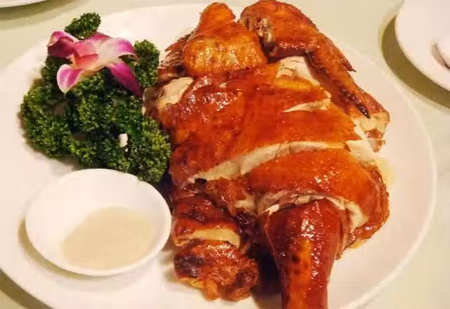 2、將土雞懸吊至通風處讓其吹風約3小時晾乾表皮後,再將雞眼戳破,避免雞放入熱油鍋中產生油爆。