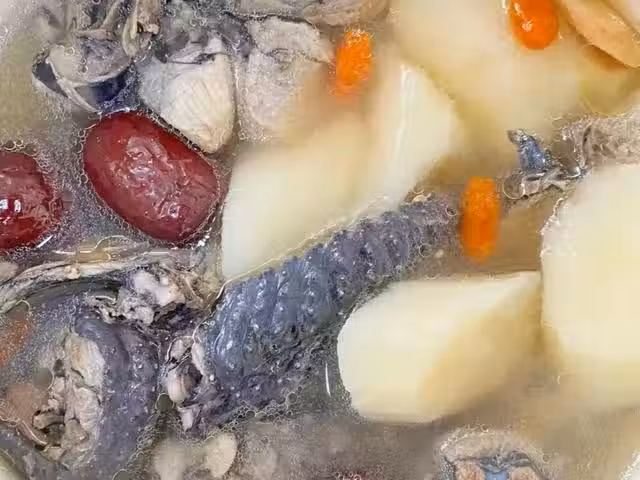 準備食材:山藥,烏雞,紅棗,薑片,黃芪,枸杞子。