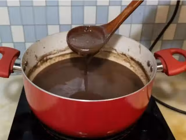 把陳皮和豆沙都ready好以後,就可以進入到最後一步。把紅豆沙倒回鍋里,這時候把之前煮紅豆湯剩下的水都加入到豆沙裡面,調到一個你自己喜歡的粘稠狀態。