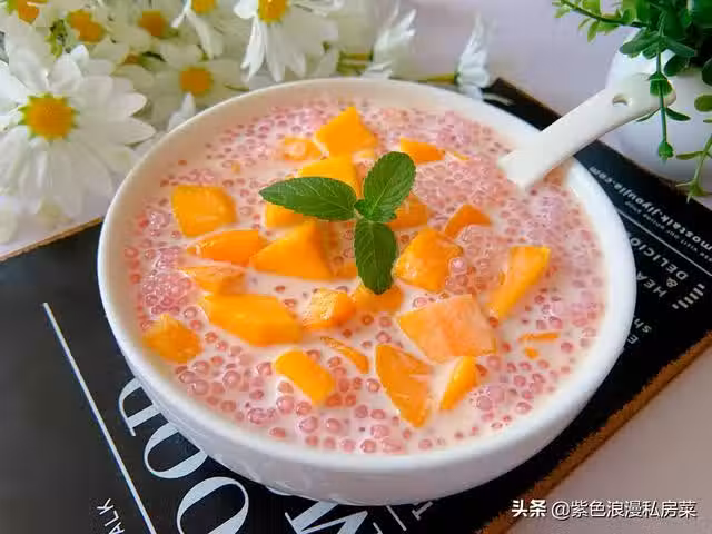 5.將西米倒入碗中,倒入牛奶,放上芒果,再放薄荷點綴一點,牛奶可以用冰牛奶,或者甜品做好以後放冰箱冷藏一下,口感會更好。