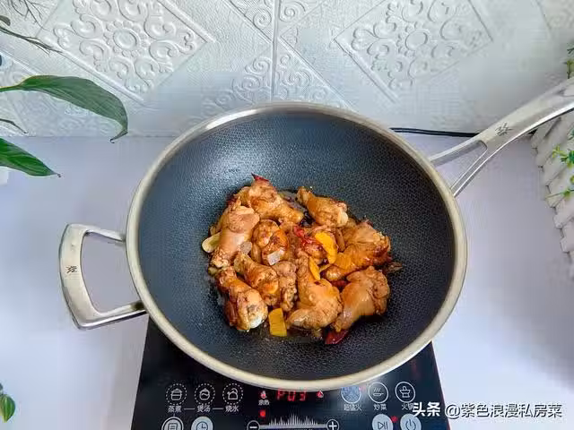 7.放入雞腿和冰糖翻炒,並倒入腌雞腿的料汁。