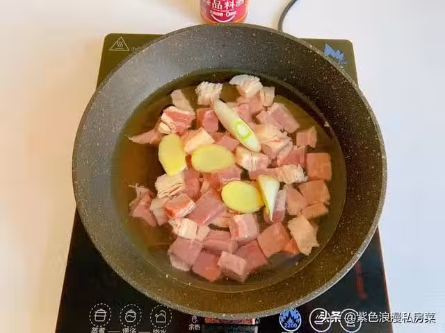 2.鍋中放清水,牛肉冷水下鍋,放一勺料酒,放蔥姜,焯水撈出,用溫熱水清洗乾淨(不要用冷水洗,不然牛肉會很柴不易燉軟爛)。