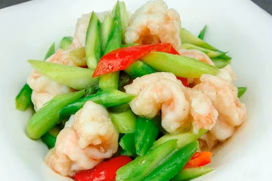 5.鍋內燒油,油燒熱以後倒入蔥姜爆香,倒入控干水分的蘆筍、蝦仁顛鍋翻炒均勻,從鍋邊淋入少許清水,加入食鹽1克,白糖少許,胡椒粉1克,開大火快速翻炒給食材入味,淋入少許水澱粉增加調料的吸附力,加入少許明油提亮色澤,翻勻後美味即成。
