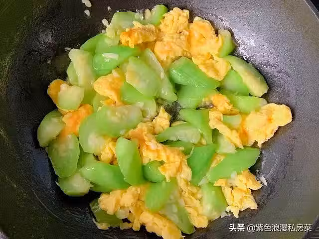 7.絲瓜變軟後,倒入雞蛋,由於絲瓜和雞蛋中已經放過鹽了,所以我沒有再放鹽。