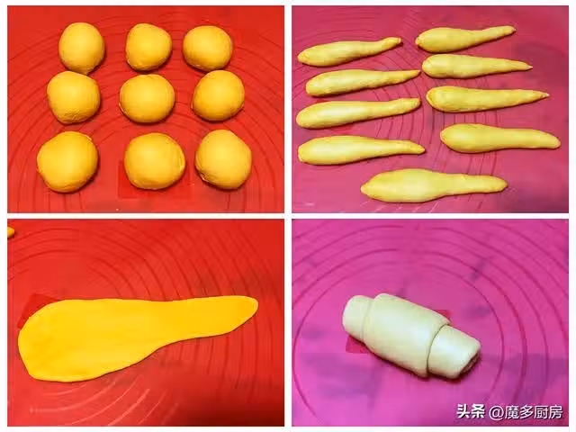 4、再把醒好的麵糰,搓成一頭細、一頭粗的錐子形。全部搓好以後,再用擀麵杖擀開,將麵糰里的氣體排出,從寬的一側捲起,收口朝下壓住。