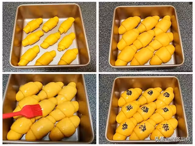 5、依次卷好9個面卷,碼放在八寸正方形烤盤裡,蓋上保鮮膜,醒發到2倍大。