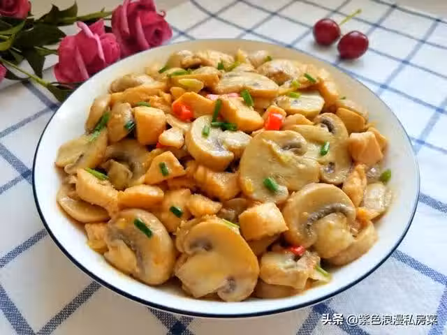 1.準備食材並洗凈,口蘑切片,雞胸肉切丁,生薑切絲,大蒜切片,小米椒切圈。