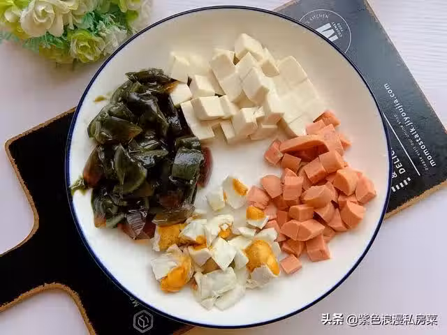 2.豆腐切小塊,皮蛋,鹹蛋切丁,火腿腸切丁,生薑切丁。我多加的其中一種食材就是鹹蛋了。