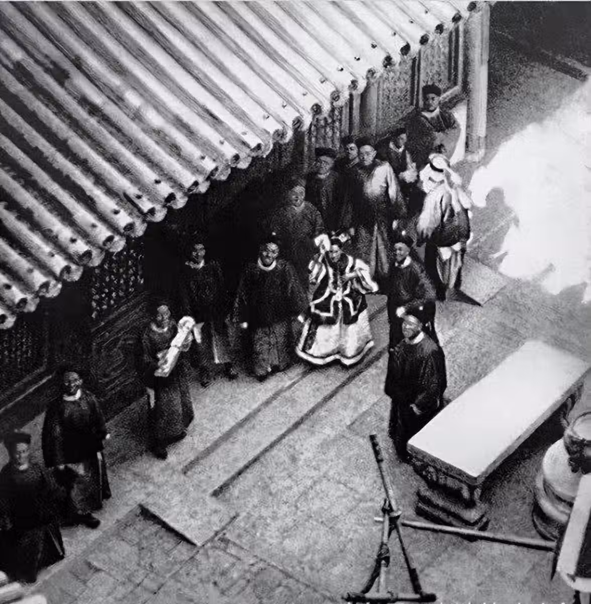 幾乎就在慈禧太后拈香時,站在城墻上圍觀的外國記者拍下了光緒皇帝,就是在他下轎子的一瞬間。從照片可以看出,光緒皇帝下轎時周圍站滿了迎接的大臣。對於拍下照片的過程,美國作家立德夫人在《我的北京花園》一書中,也給出了詳細描述: