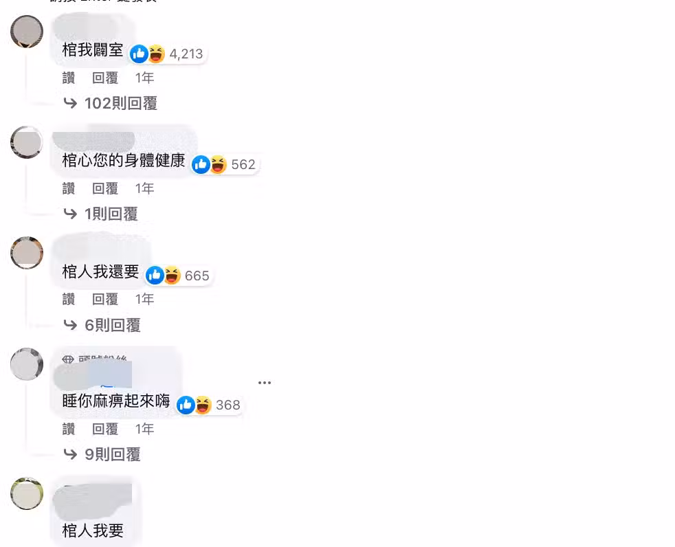 看到貼文後大家反應超熱烈,很多有梗的網友紛紛留言回覆:「棺我闢室」、「棺人我還要」、「蓋逝奇材」、「永寢(慶)房屋」、「IKEA (台語)」、「棺棺香互」、「穢土轉生」、「席夢思」、「林正英棺材店」、「好大的棺威啊」「棺渡自燃保護區」、「棺棺香互」、「歡迎棺迎」、「玩命棺頭」等趣味店名~