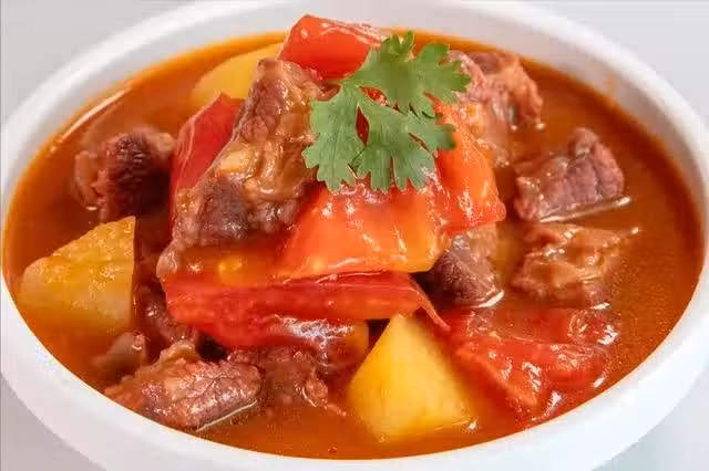 2、鍋里少來點油,倒入八角、香葉、蔥姜炒香,接著把西紅柿倒進去,炒至出湯,隨後放上牛腩,加上醬油、老抽、料酒、蚝油翻炒片刻,倒入沒過食材的開水,開始燉。燉半個鐘頭後,把土豆胡蘿蔔放進去,再燉15分鐘,就特別軟爛了,最後把湯汁收一下,開吃。
