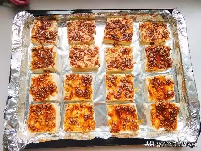 6.蒸烤箱預熱,放入烤盤,上下火180度烤15分鐘,15分鐘後取出烤盤,給豆腐翻面,刷上燒烤醬汁,再放入蒸烤箱,烤15分鐘。