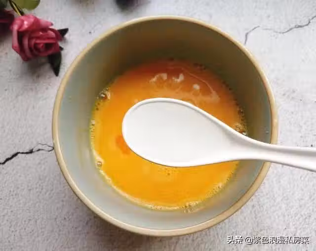 步驟三:雞蛋打入碗中,放一丟丟鹽,一勺料酒去腥,放幾滴香醋,放香醋會使雞蛋更鬆軟蓬鬆,一勺清水放清水雞蛋會更嫩滑,再用筷子打散,儘量多打一會,這樣炒出來的雞蛋才夠鬆軟。