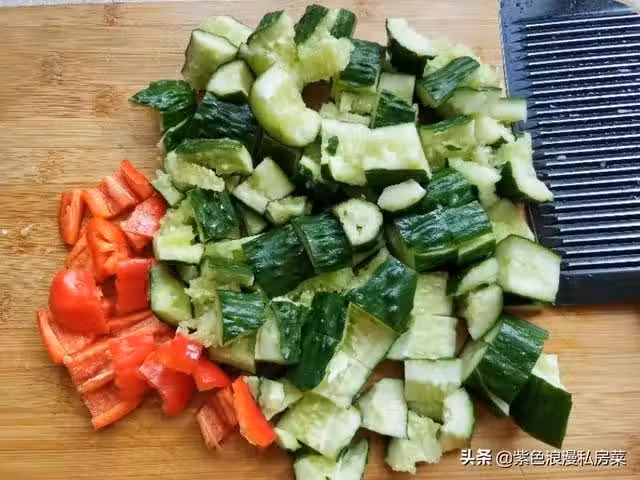 步驟一:黃瓜洗凈,去兩端,用刀背將黃瓜拍一拍,據說這樣拍出來的黃瓜更容易入味,再將黃瓜切小塊,紅椒切小塊。