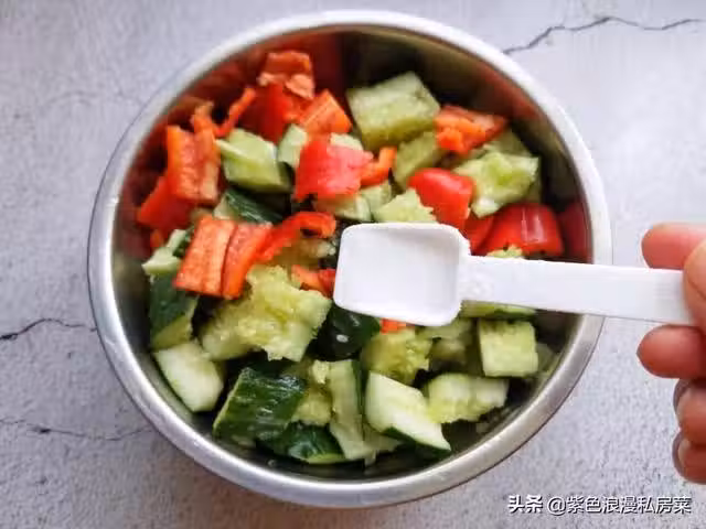 步驟二:黃瓜,紅椒放入大碗中,放一勺鹽拌勻,腌10分鐘,黃瓜會腌出水分,再將腌出來的黃瓜水倒掉,這一步很關鍵,腌過的黃瓜才會又脆又入味。