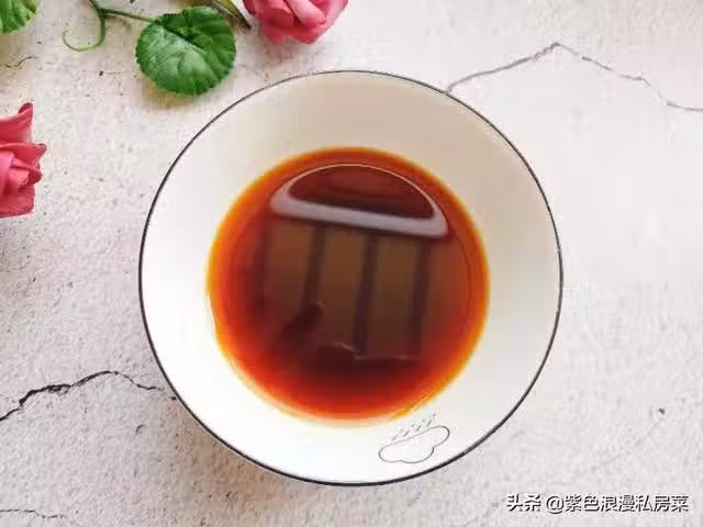 步驟二:準備一個碗汁,碗中放半勺白糖,一勺蒸魚豉油,一勺蚝油,一勺料酒,小半碗清水,攪拌均勻。