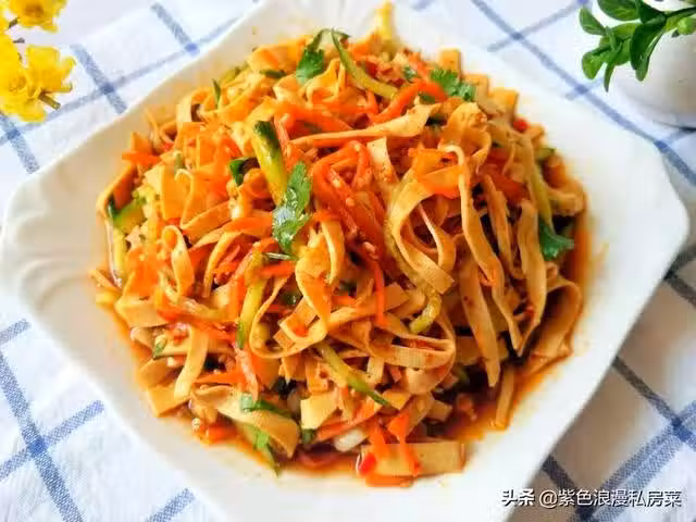 這個三絲裡面有豆腐皮,黃瓜和胡蘿蔔,做出來的菜酸辣開胃,特別下飯,營養也很豐富,我經常做給家人吃。