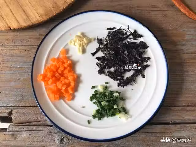 1、輔料除雞蛋外,還需要準備一小節的胡蘿蔔。還有青蔥、蒜頭,其中胡蘿蔔在處理好之後切成小碎丁。而紫菜只需要一個小片,把紫菜手撕成小碎片一併備用。