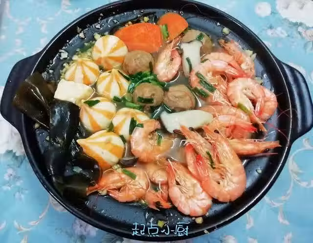 食材:活蝦250克,海帶結100克,杏鮑菇一個,胡蘿蔔一個,魚籽包和肉丸子150克,蔥2棵,蒜頭2瓣,生薑一塊,食物油、生抽、鹽和胡椒粉適量。