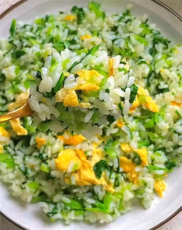 步驟三:鍋中加一點油,倒入蒜末炒香,加入剩米飯,把米飯打散,然後倒入雞蛋碎、青菜碎,翻炒均勻,加一點鹽調味即可。非常清淡,好吃。