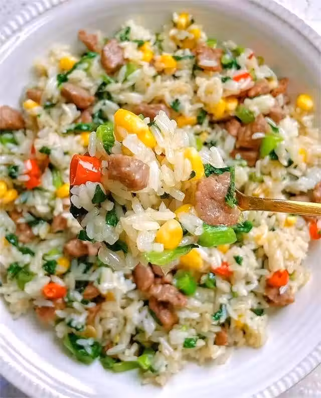 步驟二:鍋中燒油,油熱下入牛肉粒,炒至變色以後,加一點蒜和小米辣,不吃辣的,不要加了,再加入玉米粒,炒熟以後加入米飯,最後再把菜葉子倒入鍋中,加一點點鹽調味,翻炒均勻即可。