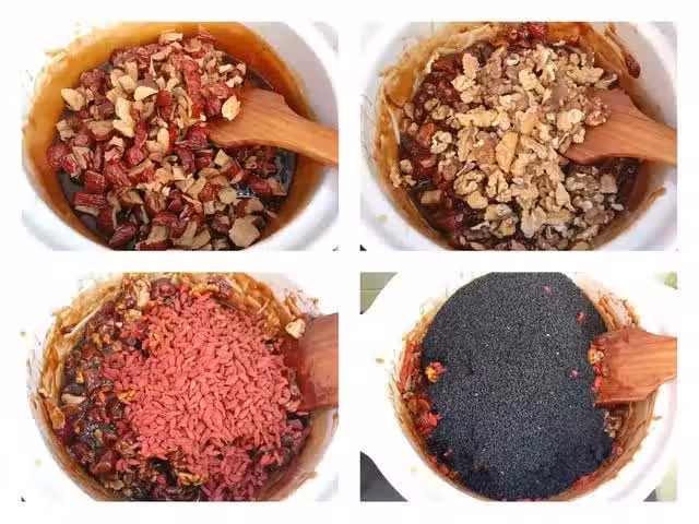 4、阿膠完全翻拌均勻之後,裝入提前鋪好油紙的模具中,這個對模具的要求不是太高,可以使用專用的阿膠模具,也可以使用蛋糕模具,表面蓋上一張油紙,用刮板或者擀麵杖將表面擀平,晾涼後取出來切塊即可。