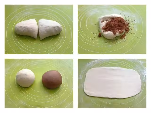 第三步:白色麵餅放在最下面,用小刷子蘸取少許的水,均勻地抹在白色麵餅上面,然後將可可粉麵餅放在白色麵餅之上,稍稍用手掌輕壓一下,讓它們更貼合,將麵餅由一側捲起來,收尾部分可以抹少許水分,將卷好的麵餅切成均勻等大的劑子,這樣巧克力饅頭胚就製作好了,將製作好的饅頭放入蒸籠中,蓋上蓋子醒發20分鐘,這是使用一次發酵法製作的饅頭,不僅省時省力,口感還十分鬆軟香甜。