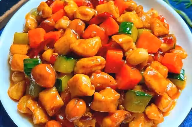 步驟四:鍋中燒油,倒入雞丁滑熟盛出。鍋中留底油,下入蔥、蒜、辣椒,炒香,再加入一勺豆瓣醬,炒出紅油,倒入胡蘿蔔丁炒至斷生,再倒入雞丁、黃瓜丁、花生米,加半勺老抽、翻炒上色,倒入料汁,翻炒至湯汁濃稠即可。