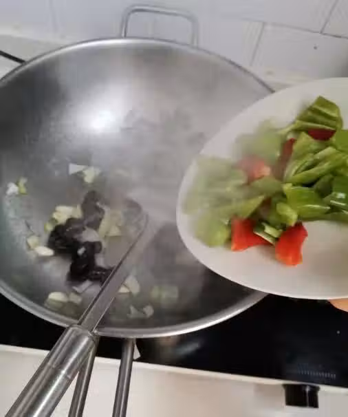 第6步:加入適量的鹽和雞肉精調味,翻炒10秒鐘調味,然後關火煮飯,即可食用美味又營養的辣椒炒山藥。