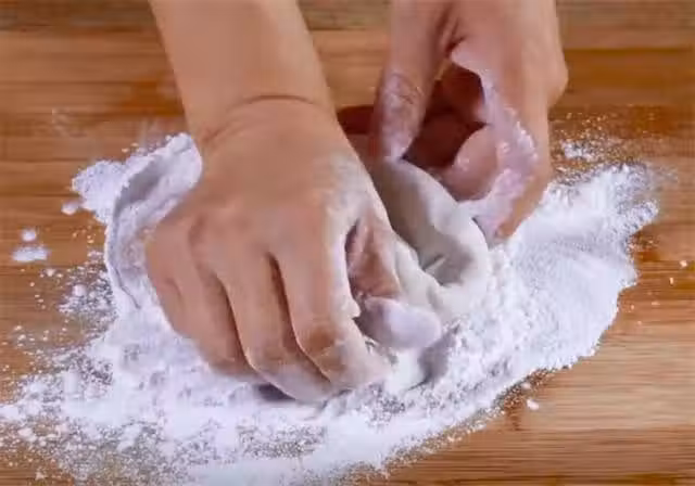 3.案板上撒些乾麵粉防粘,等不燙手的時候取出放在案板上開始揉面。