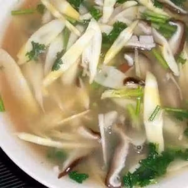 2、將竹筍、薑絲放在湯鍋中加適量清水煮15分鐘,再放香菇、金針煮5分鐘。放精鹽,味精即可。