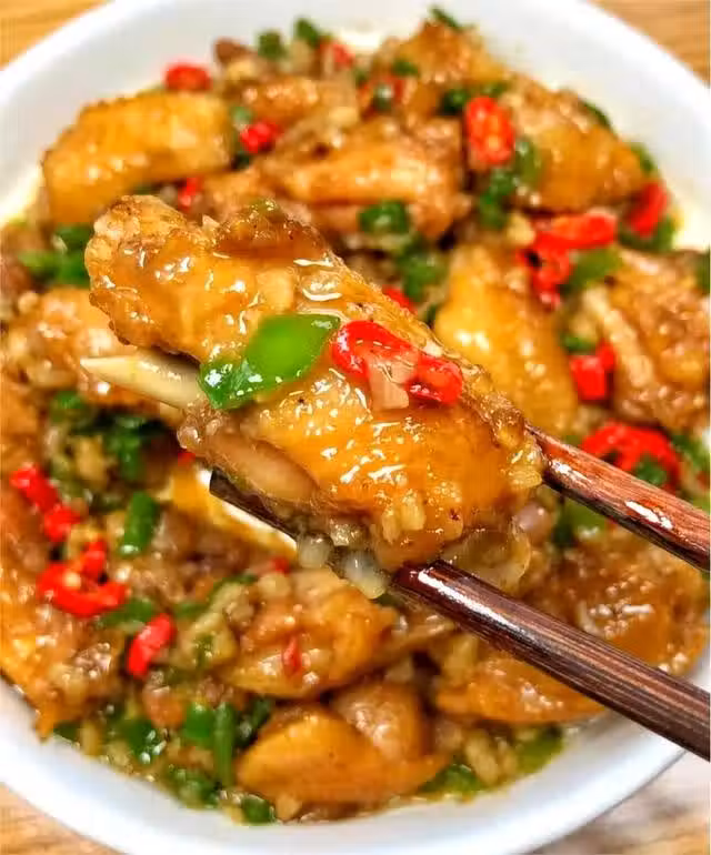 步驟四:另起鍋下入蒜末,爆香以後,倒入煎好的雞翅,加入一勺生抽、放入青紅小米椒,翻炒均勻,即可出鍋。