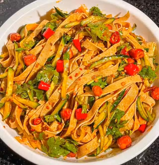 步驟一:黃瓜洗凈後切成絲,香菜洗凈後切段,千張切絲,備用。