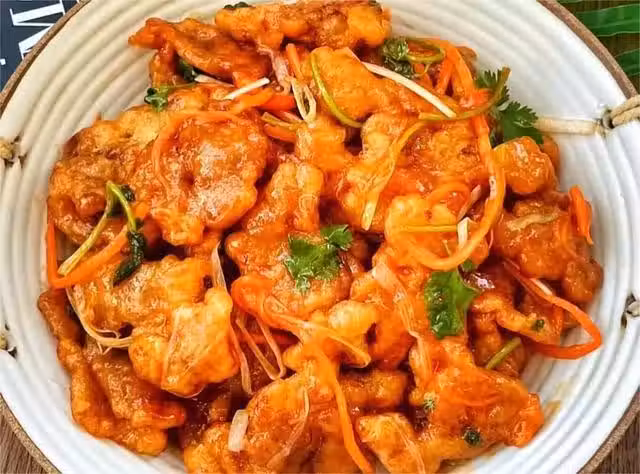 步驟五:鍋中留油,將料汁倒入鍋中煮至黏稠,加入蔥薑絲、胡蘿絲、香菜碎,再放入裡脊肉片,翻炒均勻即可。