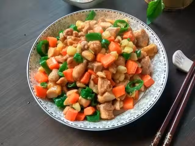 雞腿1個、胡蘿蔔1/2根、熟玉米粒150克、尖椒3個 輔料:植物油3湯匙、鹽4克、蔥1根、姜2片 、大蒜2瓣、料酒1湯匙、澱粉1湯匙、白鬍椒粉1茶匙、生抽醬油1湯匙
