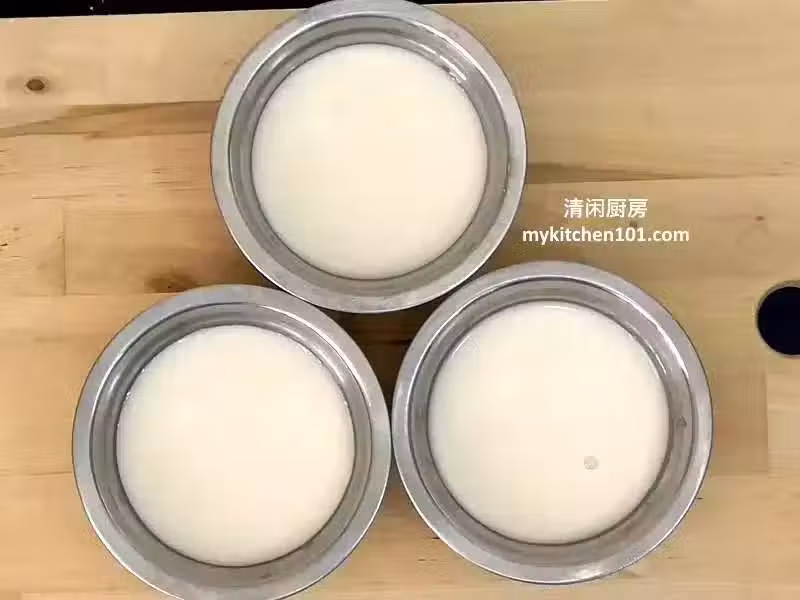 2 青色層:把清水、香蘭汁、糖和鹽混合,加熱至糖完全融化。冷卻後,加入椰奶和所有粉類拌勻後過篩。把青色粉漿分成3等份備用 (每份約160 克)。